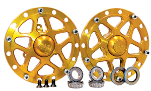 COMPLETELY REDESIGNED AND forged for added strength and increased weight savings. Remember If it spins, get it as light as you can!! Machined out of the highest quality AMERICAN MADE MATERIALS and Anodized Gold for a sharp new high-tech look. For 2009 you can now buy these Hubs with LOW DRAG ANGULAR CONTACT BEARINGS. These Bearings create less drag in return making your car roll around the Track Faster & Freer. Both styles of Hubs come with Bearings, Races, Screw On Dust Caps, Wheel Studs, and Nuts as well as Rotor Mounting Flush Head Bolts. A Complete Kit!!