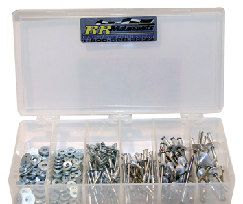 A NICE LITTLE touch to anyone’s tool box. This Handy 300-Piece Kit comes with 1/8” and 3/16” Pop Rivets with Steel Head, with Steel Mandrel & Aluminum Head with Steel Mandrel and Aluminum Head with Aluminum Mandrel. Also comes with an Assortment of Backing Washers, as well as the Large Headed 3/16” Style too. All Neatly Packed Up In A Plastic Carrying Case.