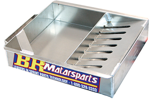 EVERY TEAM NEEDS one of these. Slide it under the Rear End, pop off the Rear Cover. Special Drain back holds Gears out of the Oil and permits full drainage back to the Pan. Makes reusing your Rear End Lube very easy. Special Corner Notch lets you pour the Lube with no mess!! All Aluminum Construction, Heli Arc Welded. A Real Trick Tool For Your Pit!