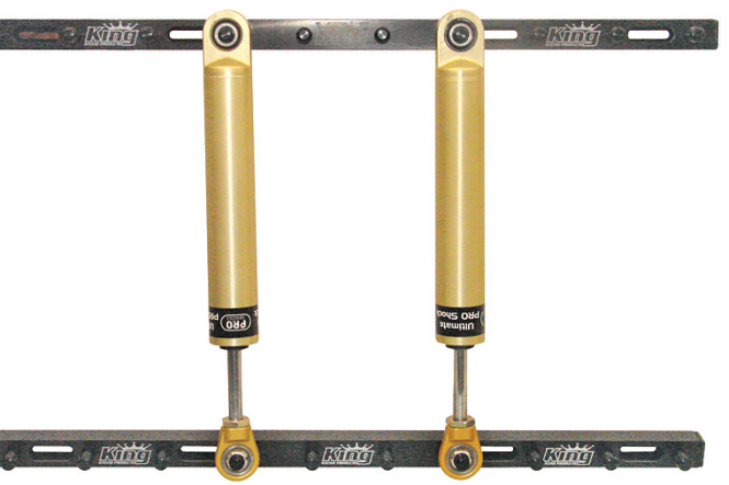 THIS ALL ALUMINUM Anodized Finished Rack will hold 10 Shocks of any length. Recessed O-Rings hold them in place till you pull them off. Just drill thru the adjustable mounting rail and attach to your Trailer Wall or put them on your Pit Cart.
